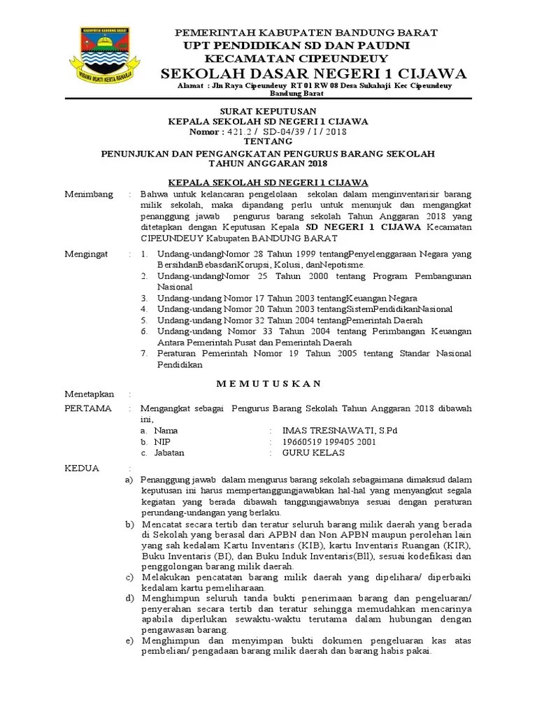 Contoh sk bendahara bos doc. Contoh sk pengangkatan bendahara sekolah.docx. Contoh sk panitia uts/pts sd smp sma smk tahun 2021/2022 . Contoh sk pengangkatan bendahara sekolah docx . Download surat permohonan perubahan specimen bank, sk bendahara bos. Saat ini menghadapi proses pergantian bendahara, maka dari itu jika nama bendahara . Para pemirsa blog tentangwebsites, barangkali ada salah satu diantara kalian yang menjabat sebagai kepala sekolah atau bendahara bos pada medrasah, . Bapak/ibu dimanapun berada, seperti kita ketahui bahwa setiap sekolah baik negeri maupun swasta yang menerima dana . Berikut ini adalah contoh format/draft surat keputusan pengangkatan bendahara sekolah dalam rangka memenuhi standar administrasi sekolah:. 1 (satu) lembar perihal : Surat keputusan sekretaris pengadilan negeri tegal kelas ib. Find out the most recent pictures of contoh surat sk bendahara sekolah here,. Kategori word, pendidikan, sd, sekolah, sk, surat, dengan keterangan 잼 le contoh sk pengangkatan bendahara sekolah ditandatangani oleh kepala sekolah, download .